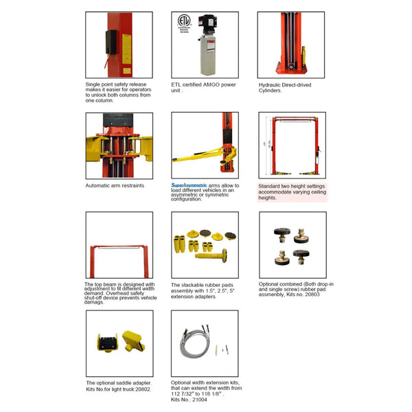 The AMGO OHX-10H comes with comprehensive warranties, including five years on steel components, three years on hydraulic parts, and two years on electrical components, reflecting its quality and durability. CE approved and certified, meeting or exceeding European Standard EN-1493 requirements, this lift is a testament to AMGO’s commitment to safety and excellence. Whether for routine maintenance or complex repairs, the AMGO OHX-10H 2 Post Car Lift is an indispensable asset, offering unmatched performance, safety, and flexibility for modern automotive workshops.