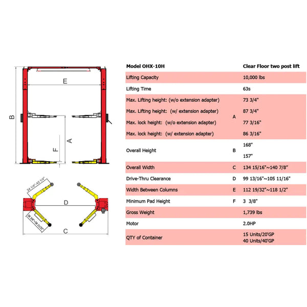 This 2 post hoist is not only robust but also designed with user convenience in mind, featuring stackable adapters (1.5", 2.5", 5") as standard. With a lifting capacity of 10,000 lbs and capable of reaching heights between 78 3/4" to 87 3/4", the OHX-10H is suitable for a wide range of vehicles. The lift is powered by a 2.0HP motor, ensuring efficient operation with a lifting time of 63 seconds.