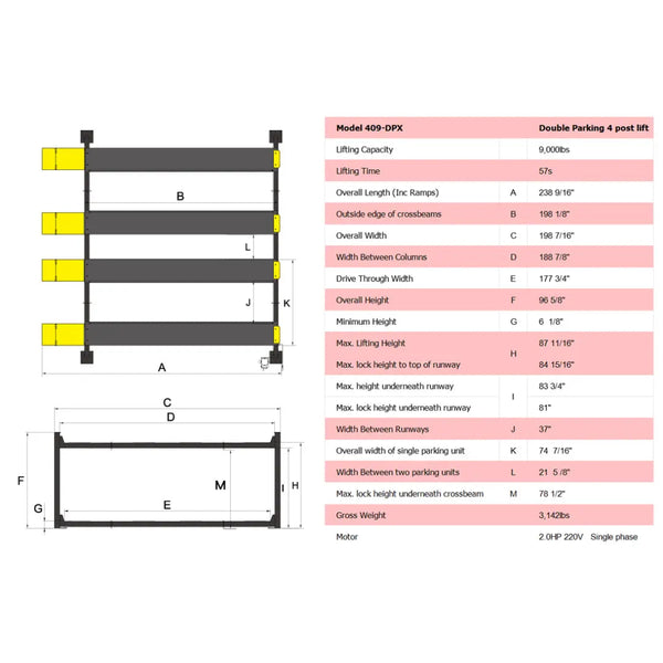 409-DPX 9,000 lb Double Parking 4 Post Lift