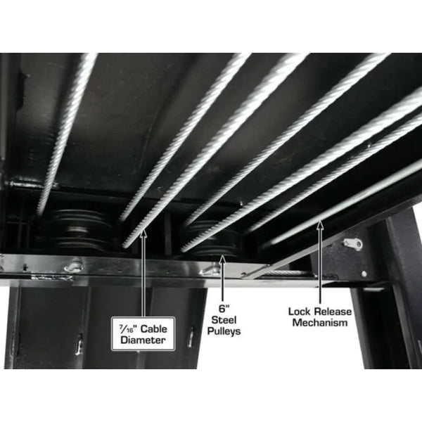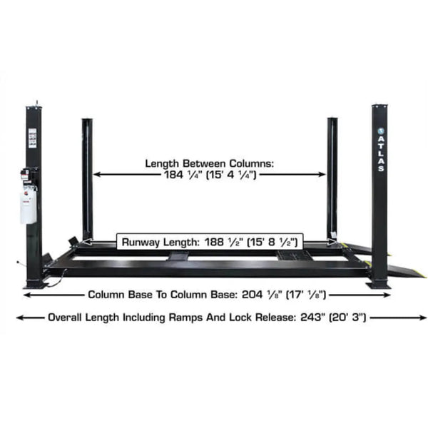 The Atlas® APEX9 ALI certified 4 post lift is a heavy duty hobbyist and commercial grade lift and is a true 9000 LB lift. The APEX9 is extra long and allows the lift to handle some of the longest wheel base vehicles out there. The APEX9 is also extra wide allowing even Diesel Duallys to be driven onto the runways. The APEX9 also features extra lift height so everything from Smart Cars® to a Dually can be parked both below and on the runways.