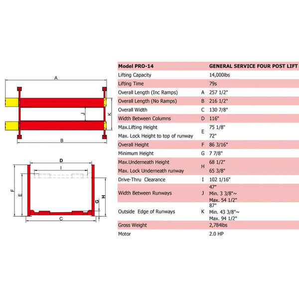 Finished in durable, powder-coated steel, the Pro-14 is built to withstand the daily grind of busy shops while keeping downtime to a minimum. Whether you’re doing repairs, inspections, or storage, this 4 post lift gives you the performance edge your garage needs.