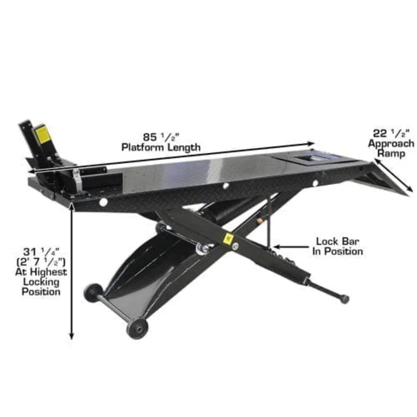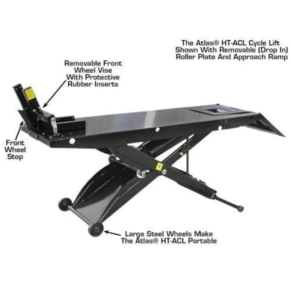 The Atlas® ACL motorcycle lift has a heavy gauge (diamond plated) platform length of 85 1/2 inches and an additional 20 inch removable approach ramp.