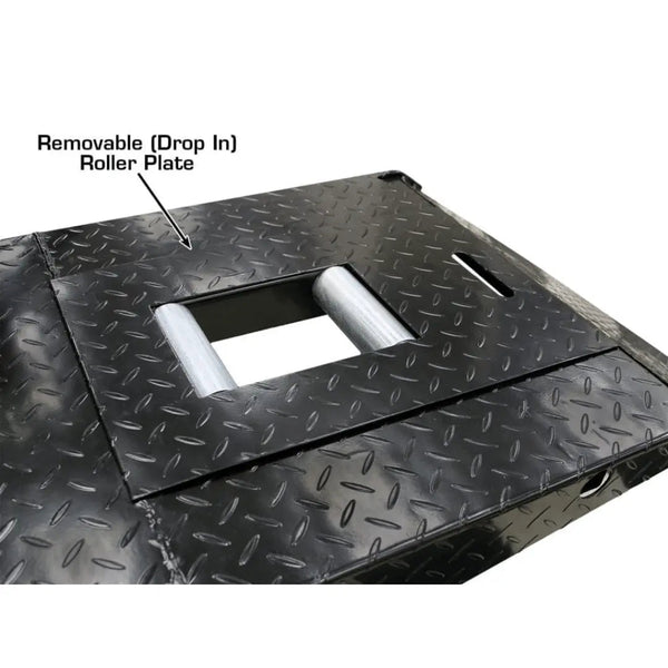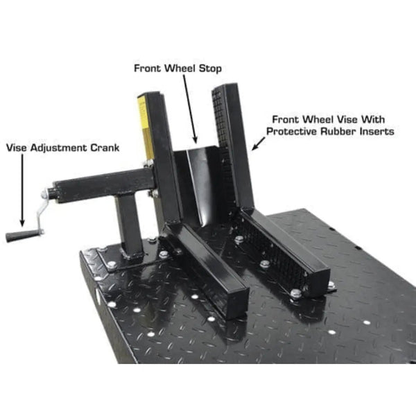 This is a complete motorcycle lift that includes an adjustable front (padded) wheel vise and a heavy duty air operated foot valve for easy raising and lowering. The defining feature of the ACL motorcycle lift is a removable plate at the rear of the lift. The plate can be removed and left off to allow more access to the rear tire or the plate can be replaced with an included roller plate. The roller plate allows the rear tire to be spun for work and testing. Finally, the ACL also includes the stabilizing bar at no extra charge. This bar provides greater stability for the raised platform by increasing the “footprint” of the lift.