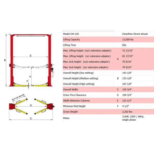 OH-12S (Short) 12,000 lb 2 Post Lift
