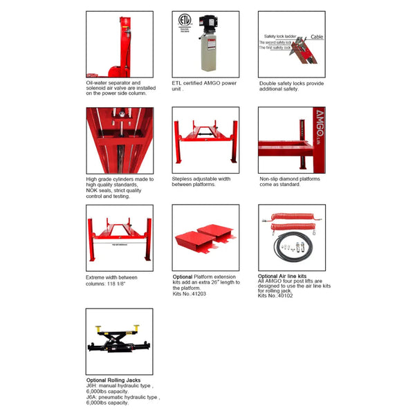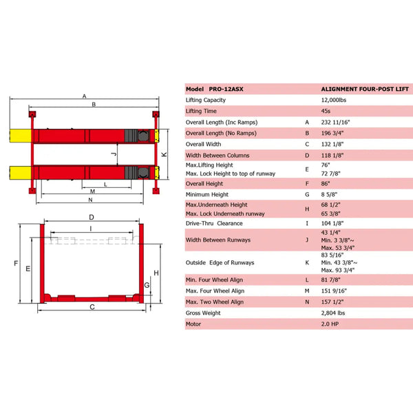Upgrade your auto shop with the AMGO PRO-12ASX 4-Post Alignment Lift, designed to handle up to 12,000 lbs. This lift is perfect for a variety of vehicles and features air-released safety locks and mechanical self-locking for secure use. The adjustable turnplate pockets and skid-proof diamond platform add versatility and safety to your operations.