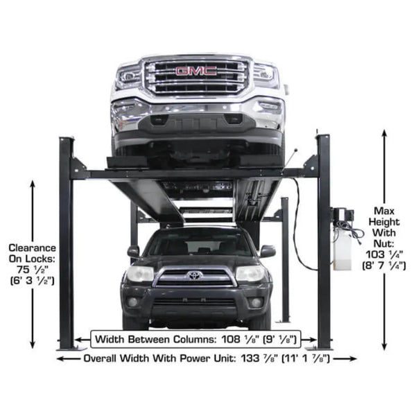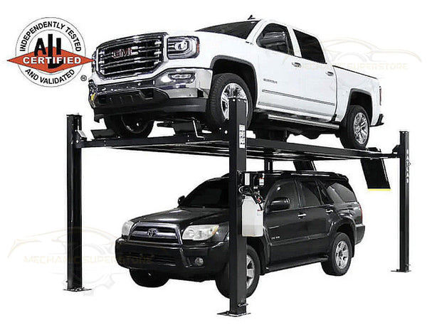 The Atlas® APEX9 ALI certified 4 post lift is a heavy duty hobbyist and commercial grade lift and is a true 9000 LB lift. The APEX9 is extra long and allows the lift to handle some of the longest wheel base vehicles out there. The APEX9 is also extra wide allowing even Diesel Duallys to be driven onto the runways. The APEX9 also features extra lift height so everything from Smart Cars® to a Dually can be parked both below and on the runways.