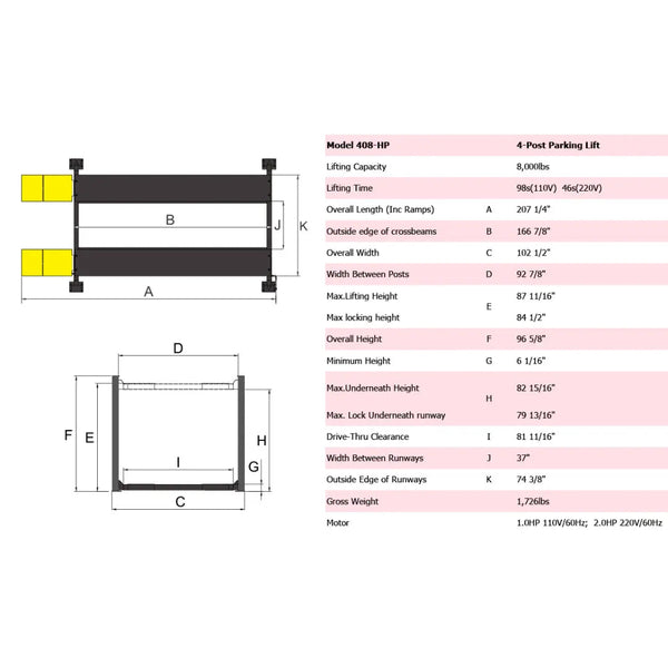The lift's maximum lifting height of 87 3/4 inches and an overall height of 96 5/8 inches underscore its capacity to accommodate taller vehicles with ease, while the generous underneath height of 83 inches offers unparalleled access for maintenance or storage purposes. The 408-HP’s thoughtful design also includes a minimum height of just 6 1/8 inches, ensuring low-profile vehicles can be easily lifted without hindrance.