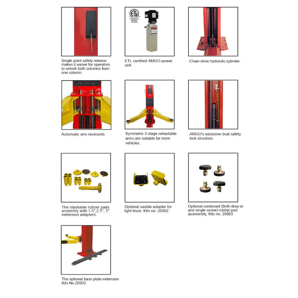 Safety is a paramount feature of Amgo auto lifts, and the BP-9X is no exception. It features a single-point safety release, allowing operators to simultaneously unlock safety locks from both columns. The dual locking system adds an extra layer of security. Automatic arm restraints ensure the arms remain locked in position, while self-lubricating UHMW Polyethylene sliders and bronze bushings contribute to the lift's durability and smooth operation.