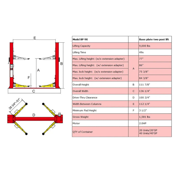 The Amgo BP-9X boasts a lifting capacity of 9,000 lbs, making it robust enough to handle a wide array of vehicles. With a gross weight of 1,590 lbs and a rapid lifting time of just 49 seconds, this lift combines efficiency with power. The inclusion of 4 three-stage arms enhances its versatility, accommodating more vehicle types with ease.