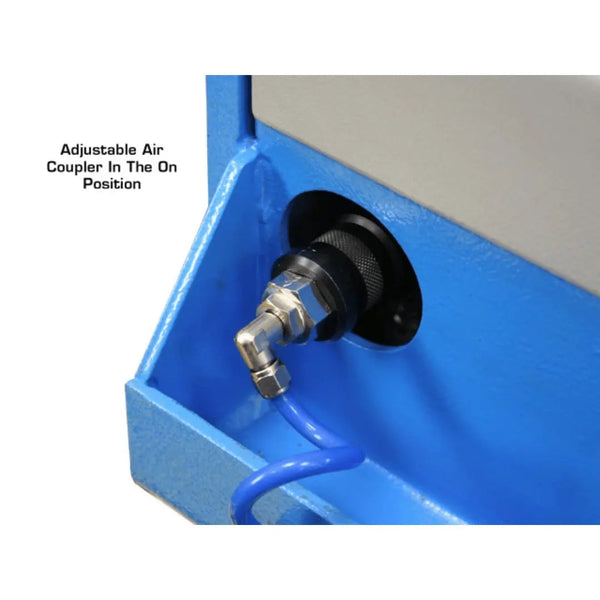 The separate control panel may be conveniently positioned to allow easy access for the operator. The 220 volt (single phase) electric/hydraulic power unit is housed inside the metal control panel box. The push button controls activate the raising and lowering of the lift. The sophisticated air actuated lock system is automatically engaged and disengaged as the lift is being raised or lowered. The lift has a safety lowering limit switch. Once the lift platforms are lowered to within 10" of the ground, the lift automatically stops its descent. The Down button needs to be released and depressed again to allow the lift to go down completely.