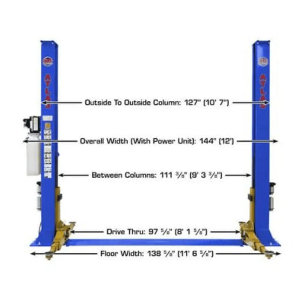 The Atlas® Platinum PVL9BP is a 9000 LB capacity, base-plate two-post lift designed for professional service centers. The open-top design of this lift makes it ideal for garages with low ceilings or for customers who don’t want to worry about the limitations of a top beam. The total column height is 111 1/8″ (9′ 3 1/8″). The Atlas® Platinum PVL9BP can lift a range of the most common vehicles on the market, both foreign and domestic, while also having the capacity to handle both full-size pickups and commercial vehicles.